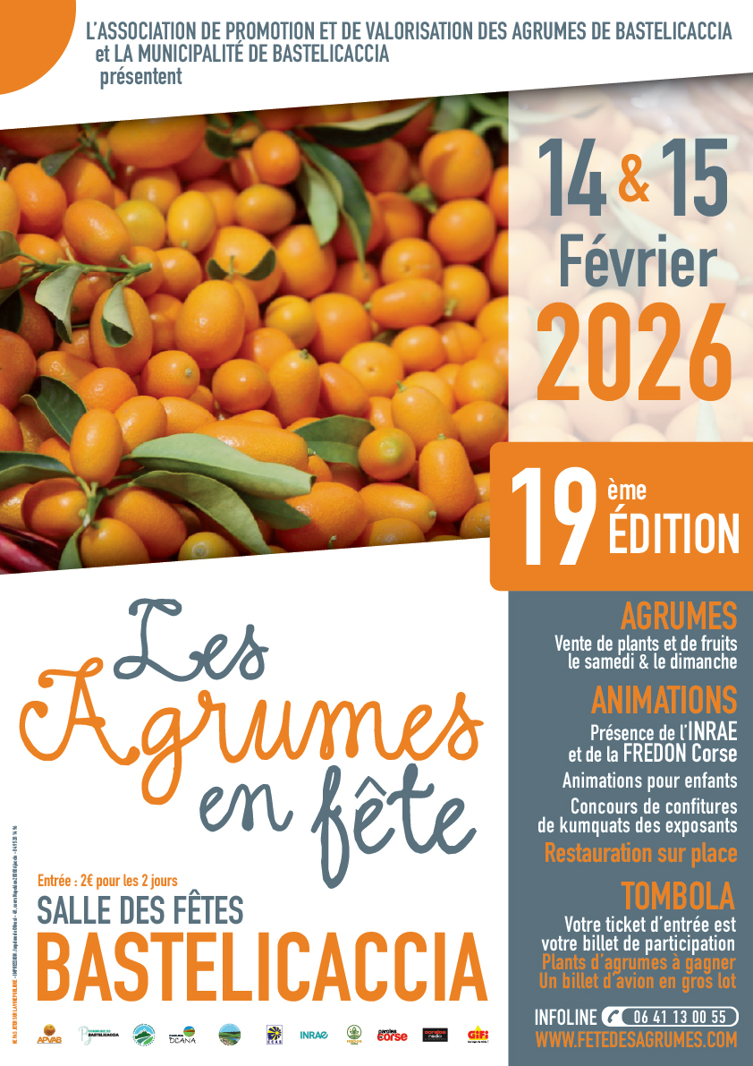 C’est avec grand plaisir que l’Association de Promotion et de Valorisation des Agrumes de Bastelicaccia (APVAB), organisatrice des Agrumes en Fête, vous informe que la 19ème édition se déroulera les 14 et 15 février 2026 à la salle des fêtes de Bastelicaccia.